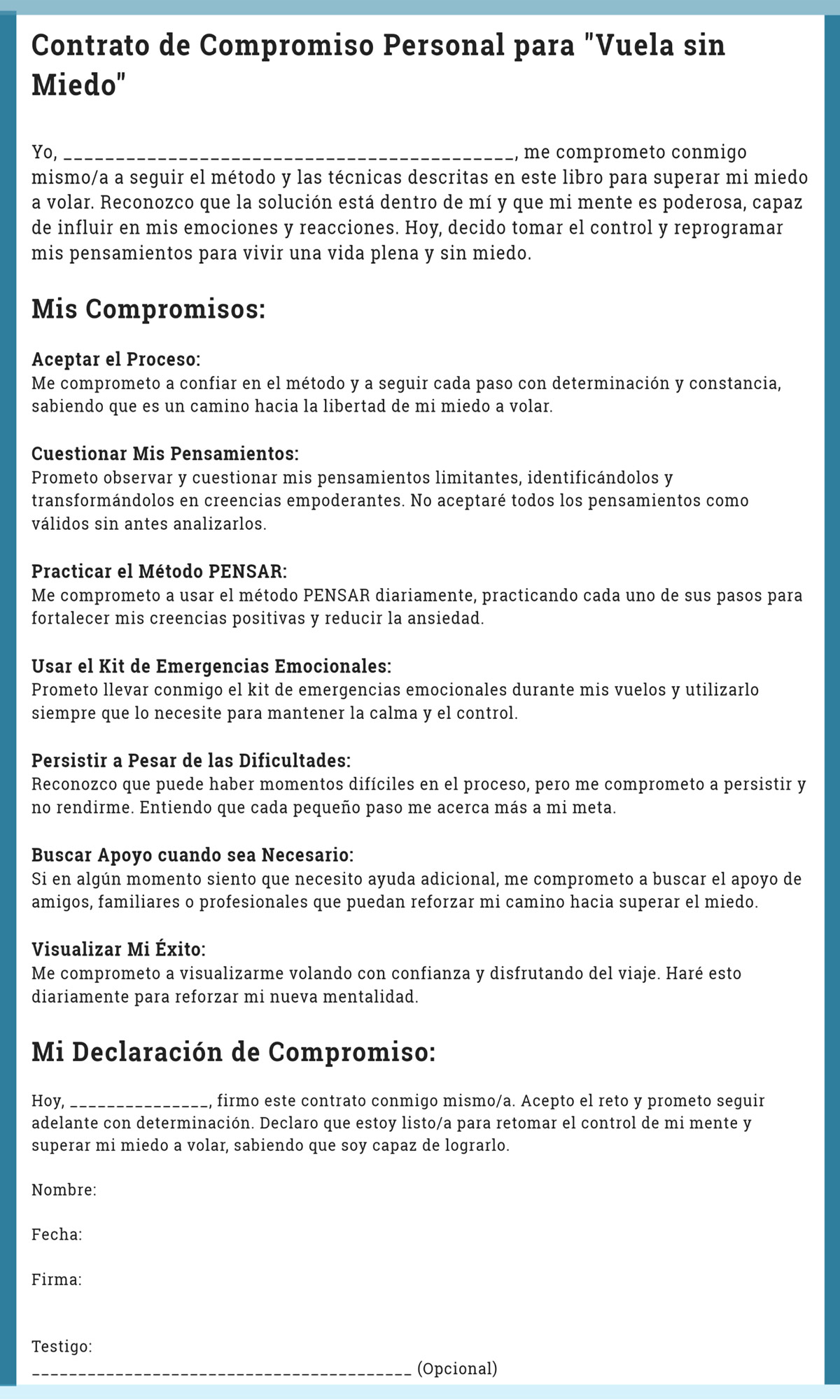 Superar el miedo a volar no se trata solo de leer un libro, sino de tomar acción. Y todo comienza con una decisión. En la versión impresa de este libro, encontrarás tu Contrato de Compromiso en la página 310.